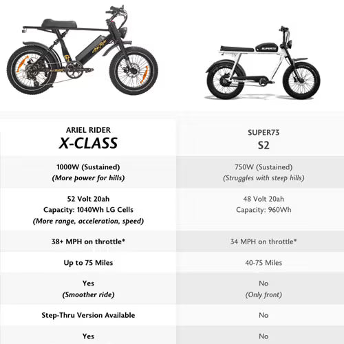 Overall the X-class and Super73 are similar. They are both fat tire scrambler/moped style 20" E-bikes. However the X-Class has more power, range and features than the S2. The more powerful 1000w motor and higher voltage will conquer steep hills better.