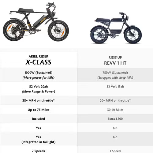 Overall the X-class and Revv 1 are both fat tire moped style 20" electric bikes. However the X-Class has more power, range, suspension and other features, giving you the best value for your money.