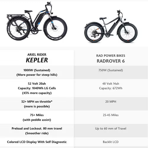 Overall the Kepler and the RadRover 6 are both fat tire E-bikes. However the Kepler has more power, range and features than the Rover 6. The Kepler is going to handle steep hills better and get you there quicker with it's more powerful motor. Also the Kepler comes with several extra features like racks, color display etc. that the RadRover doesn't...