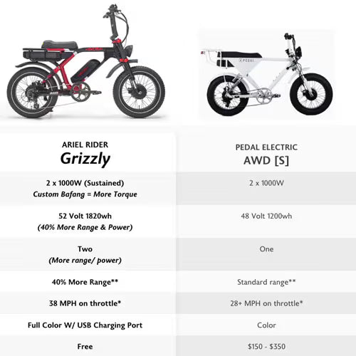 Ariel Rider Grizzly and Pedal Electric AWD [S] both are dual motor electric bikes which focus on high power, speed and traction. Despite both all wheel drive electric bikes having common parts there are some major differences.