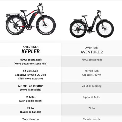Overall the Kepler and the Aventon Aventure 2 electric bikes are similar fat tire E-bikes. However the Kepler has significantly more power, and range. With the Kepler you won't have range anxiety. Despite all these added features, the Kepler is lighter than the Aventure.The Kepler is going to handle steep hills better and get you there quicker with it's more powerful motor. Also the Kepler features premium brakes...
