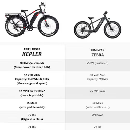 Overall the Kepler and the Zebra are very similar fat tire E-bikes. However the Kepler has more power, range and is lighter than the Zebra. The Kepler is going to handle steep hills better and get you there quicker with it's more powerful motor...
