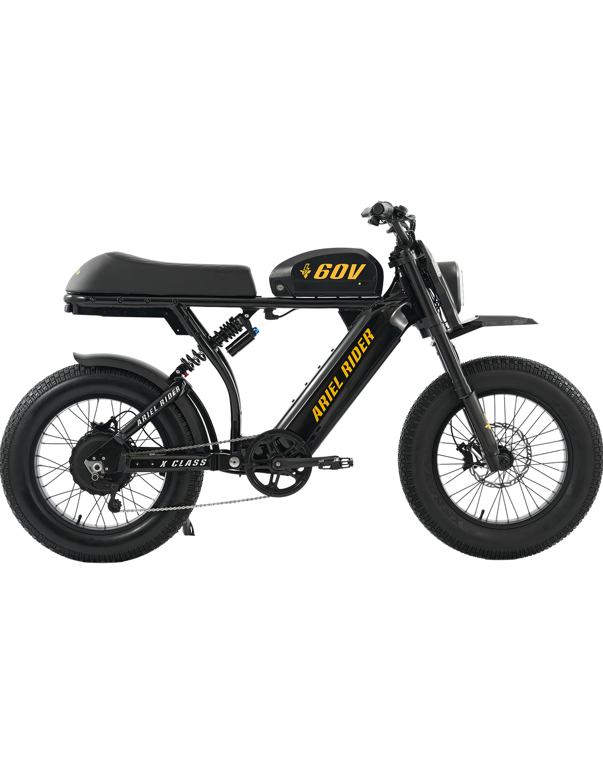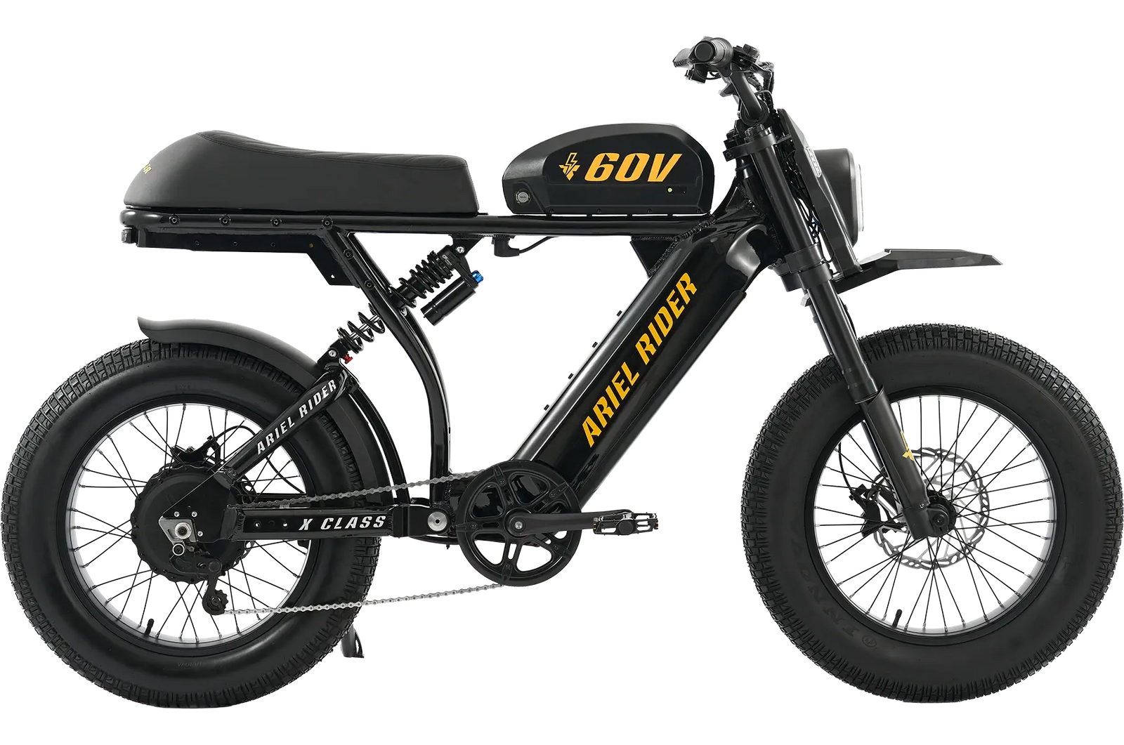 Ariel Rider X-Class 60V electric bike with long saddle, dual suspension, and fat tires for comfort and performance.